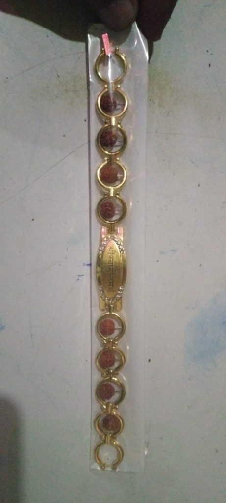 This is a Swami Samarth Panchmukhi Rudraksha bracelet. It is a conceptual and sanctified piece with a golden color, meant to be worn on the hand.